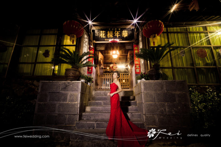 晚上,麗江古城夜景,化妝師幫我做左個復古髮型配合紅色喱士魚尾裙,出奇地美。有時好偑服佢,一日內可以諗到3個造型配合不同的禮服。由於大家好有默契,當晚攝影師發揮最大的小宇宙,相影出嚟的氣氛好好。超時收工。